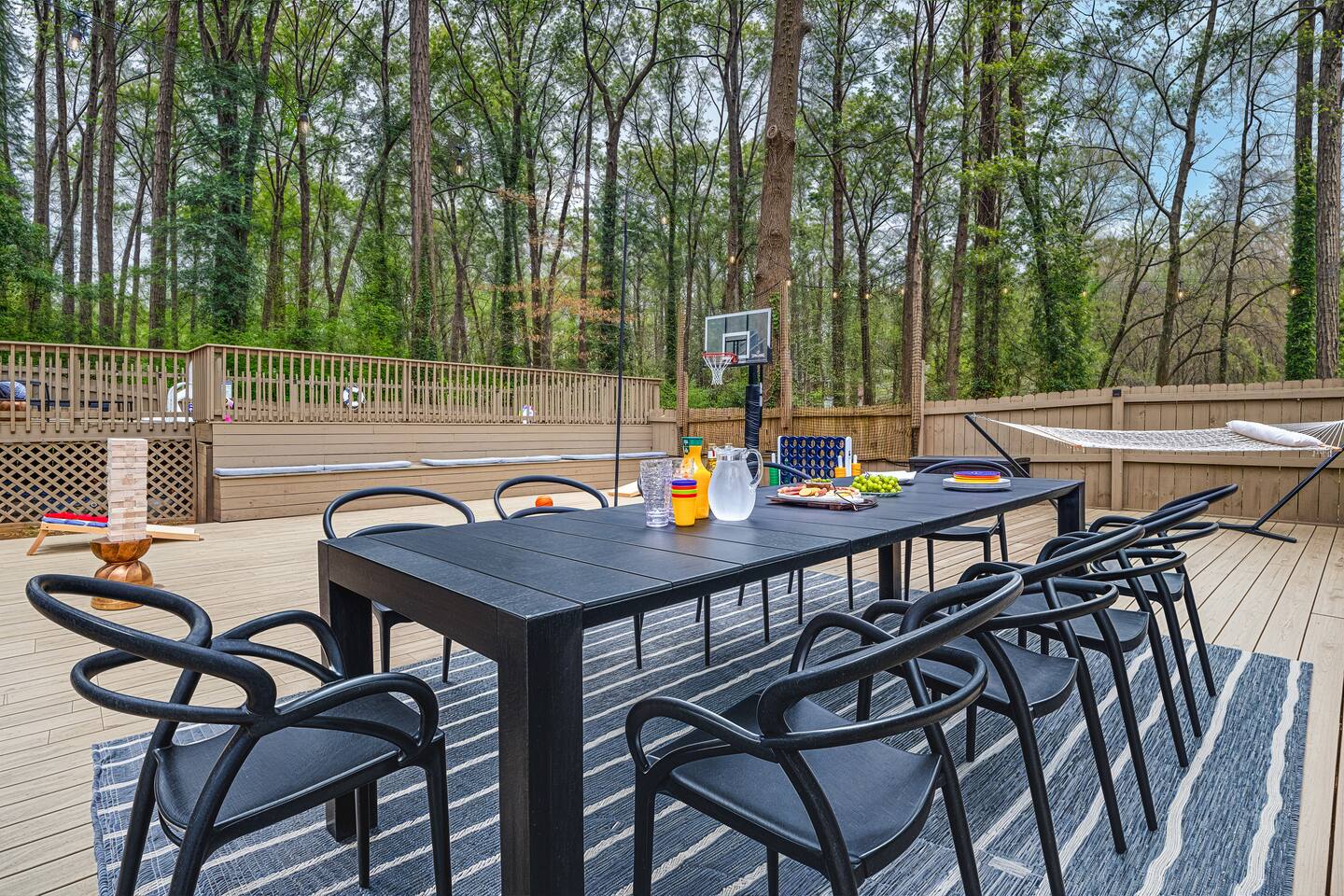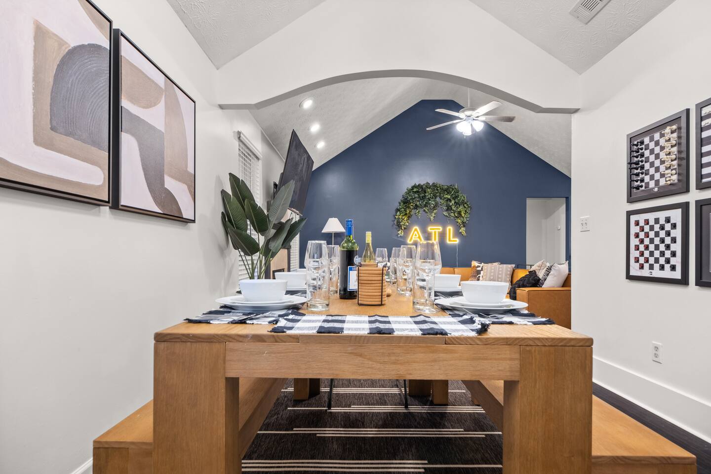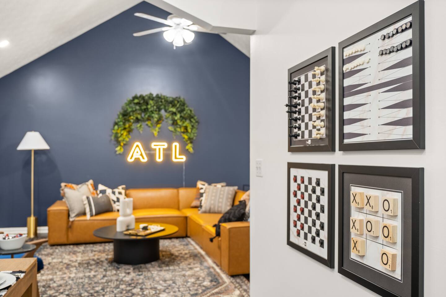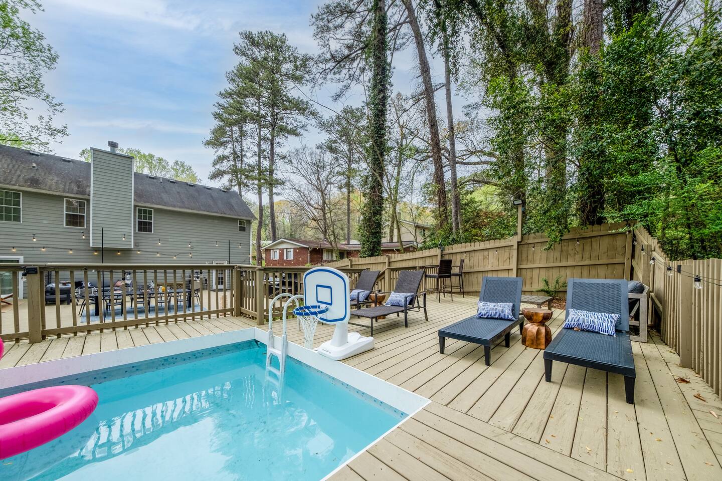 Rental Agreement and Pool & Spa Liability Waiver are required at this property. Bedrooms The home provides 5 Bedrooms and 3 bathrooms across two levels: ~Upstairs~ BR1: King Bed + Master Bathroom + TV BR2: Queen Bed + TV BR3: Queen Bed + TV 1 Shared Bathroom ~Downstairs~ BR4: Queen Bed + TV BR5: (2) Twin Bunks (4 beds total) 1 Shared Bathroom Huge Outdoor Patio • Basketball Court • Pool (4ft deep) w/ Basketball and Floaties • Hot Tub seating for 5 Guests • Luxury Day Bed • Hammock • Dining Table seating for 10 Guests • Patio Sofa/Chairs accommodating 12+ Guests • Gas Fire Pit • Stainless Steel 4-Burner Gas Grill • Double Barrel Smoker • Outdoor Games (Cornhole, Giant Jenga, Connect 4) Home Theater & Game Room • 120" Projector Screen • Edifier 2.1 Sound System • Comfortable Lounge Chairs • Popcorn Machine • Pool Table / Ping Pong Table • Shuffleboard Table • Foosball Table • ESPN Basketball Arcade • 65" TV • Arcade Games: Pacman • Hand Painted Custom Mural *** Brand new AC Unit added Oct 2024*** Centrally located to all things Atlanta: • Hartsfield Jackson Int. Airport: 20 Min • Mercedes Benz Stadium: 12 Min • Truist Park: 20 Min • World of Coca-Cola: 15 Min • Atlanta Aquarium: 15 Min • Centennial Olympic Park: 12 Min • Atlanta Zoo: 16 Min • Six Flags over Georgia: 9 Min • GA Tech: 16 Min • Ponce City Market: 20 Min • Buckhead: 22 Min *** Large Events & Parties are PROHIBITED. As per Airbnb's policies; if an event or party is detected, guests will be asked to vacate the property via local law enforcement. *** If you are hosting a small gathering or a birthday party, please feel free to reach out and we can talk about it. The "ATL Patio Paradise" is a 2000+ sqft single family home with an enormous 1000+ sqft, two level private, fenced outdoor patio. With 5 bedrooms and 3 bathrooms, this spacious house can comfortably accommodate up to 12 guests. Living Room Step into this beautiful space adorned with a warm ATL sign, casting a soft glow against lush greenery, creating an inviting ambiance that's both chic and welcoming. Sink into the comfort of our oversized sectional, perfect for lounging and relaxation after a day of play. Immerse yourself in entertainment with a 65" Smart TV, offering endless streaming options for your viewing pleasure. Kitchen & Dining From the living room walk into a fully equipped kitchen with a brand new pot & pan set, indoor and outdoor dinnerware, kid-friendly dinnerware and cutlery, complimentary coffee, spices and condiments. Enjoy a family meal at the picnic style dining table and play a fun game of checkers or tic-tac-toe on the interactive wall-art. Additionally a high chair is available for use located in the pantry. Bedrooms There are 3 bedrooms located on the main floor. The master bedroom boasts a king-sized canopy bed, 65" TV with an Amazon fire stick and dimmable lights allowing you to set the perfect ambiance for relaxation or productivity. A sleek vanity desk awaits, ideal for your morning routine or evening pampering sessions. Enjoy the en-suite bathroom where you'll find both a shower and lounging tub along with double vanity sinks. Whether you're unwinding after a long day or preparing for a new one, this master bedroom offers everything you need for your stay. Two additional bedrooms located on the main floor offer a luxurious queen bed with ample storage for clothing between the dressers and closets as well as Amazon fire stick enabled TV's for your viewing pleasure. Right outside these bedrooms you can find a shared full bath. On the lower level there is an additional luxurious queen bedroom with ample storage. Down the hall is a large, newly renovated shared full bathroom. Home Theater Room Welcome to our ultimate home theater experience! Immerse yourself in the action on our massive 120" projector screen, paired with a 2.1 sound system that delivers crystal-clear audio, bringing movies to life like never before. Indulge in the classic cinema experience with our vintage popcorn machine and set the mood with dimmable sconce lighting and black out curtains. Sink into the plush comfort of our lounge seats while you enjoy your favorite streaming service or connect your favorite device to the provided HMDI. Located in the theater room are two twin bunk beds for a total of 4 available beds. Game Room Welcome to our epic game room, where play knows no bounds! Challenge your friends to a game of pool on our versatile table that converts to ping pong for added excitement. Test your skills on our shuffleboard table or enjoy classic arcade nostalgia with Pac-Man or our ESPN basketball Pop-a-Shot. Sit back and catch the latest game or enjoy gaming sessions on our Amazon Fire Stick enabled TV, ensuring non-stop entertainment. Note: The game room is not connected to the house HVAC and get a little chilly in the winter. Be sure to snap a photo in front of the vibrant custom mural hand painted by East Coast muralist Liza S, transforming the space into a truly unique experience. (ig: liza_s_art) Outdoor Patio Welcome to this sprawling outdoor oasis, spanning over 1000 square feet of entertainment! Decompress in the soothing waters of our 5-seat hot tub, complete with jets and lights, offering a tranquil retreat under the starlit sky. Gather around the oversized outdoor sectional and plush seating arrangement, basking in the warmth of the gas fire pit, perfect for cozy evenings with friends and family. For the culinary enthusiasts, enjoy our brand new stainless steel grill and double barrel smoker. Challenge your friends and family to a game of basketball on our court or cool off in the refreshing pool (4ft), equipped with basketball hoops and floaties for added fun. Unwind in style on our luxury day bed or sway gently in the hammock, embracing the serenity of outdoor living. Share meals and laughter at the dining table, generously accommodating up to 10 guests, while the aroma of smoked delicacie