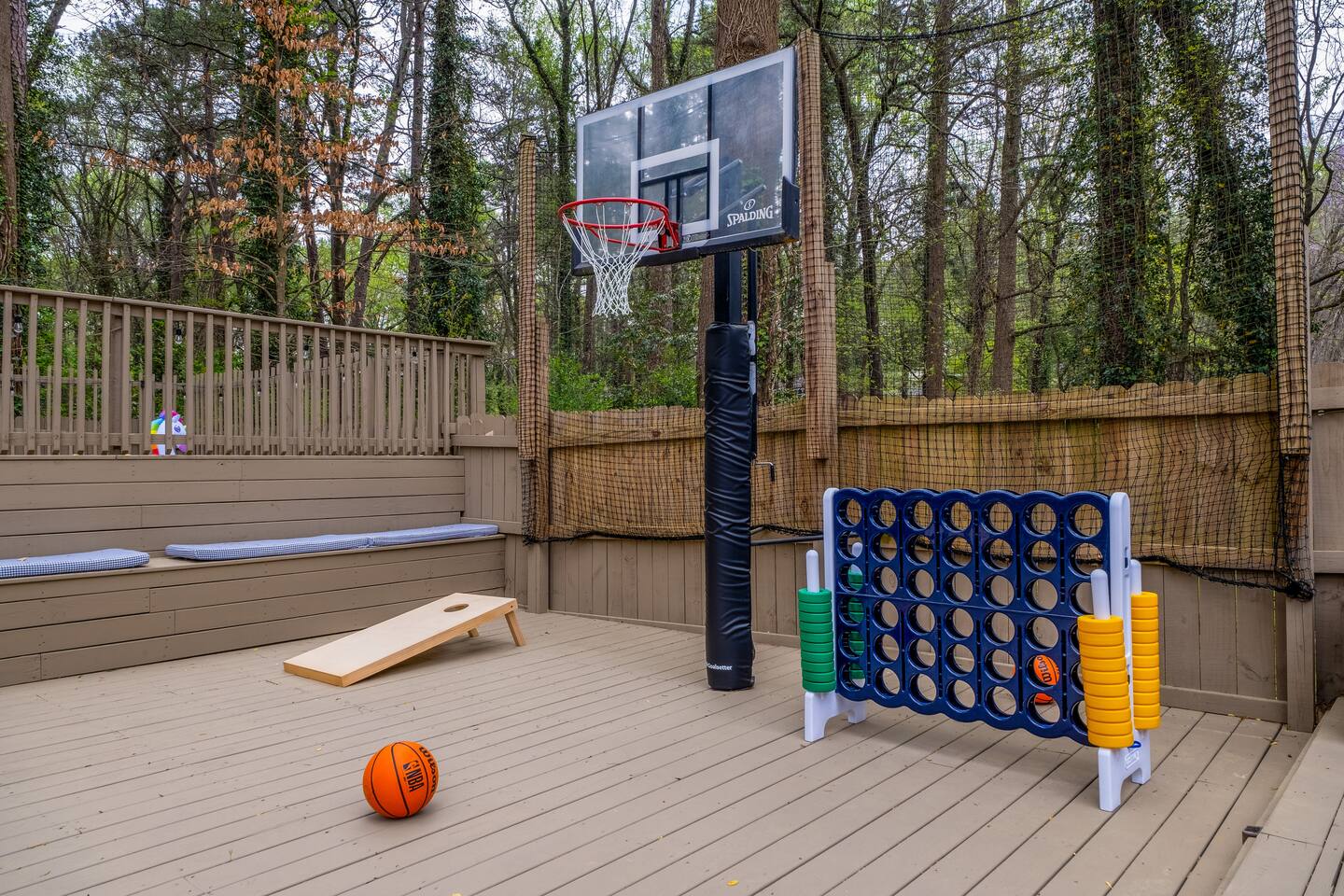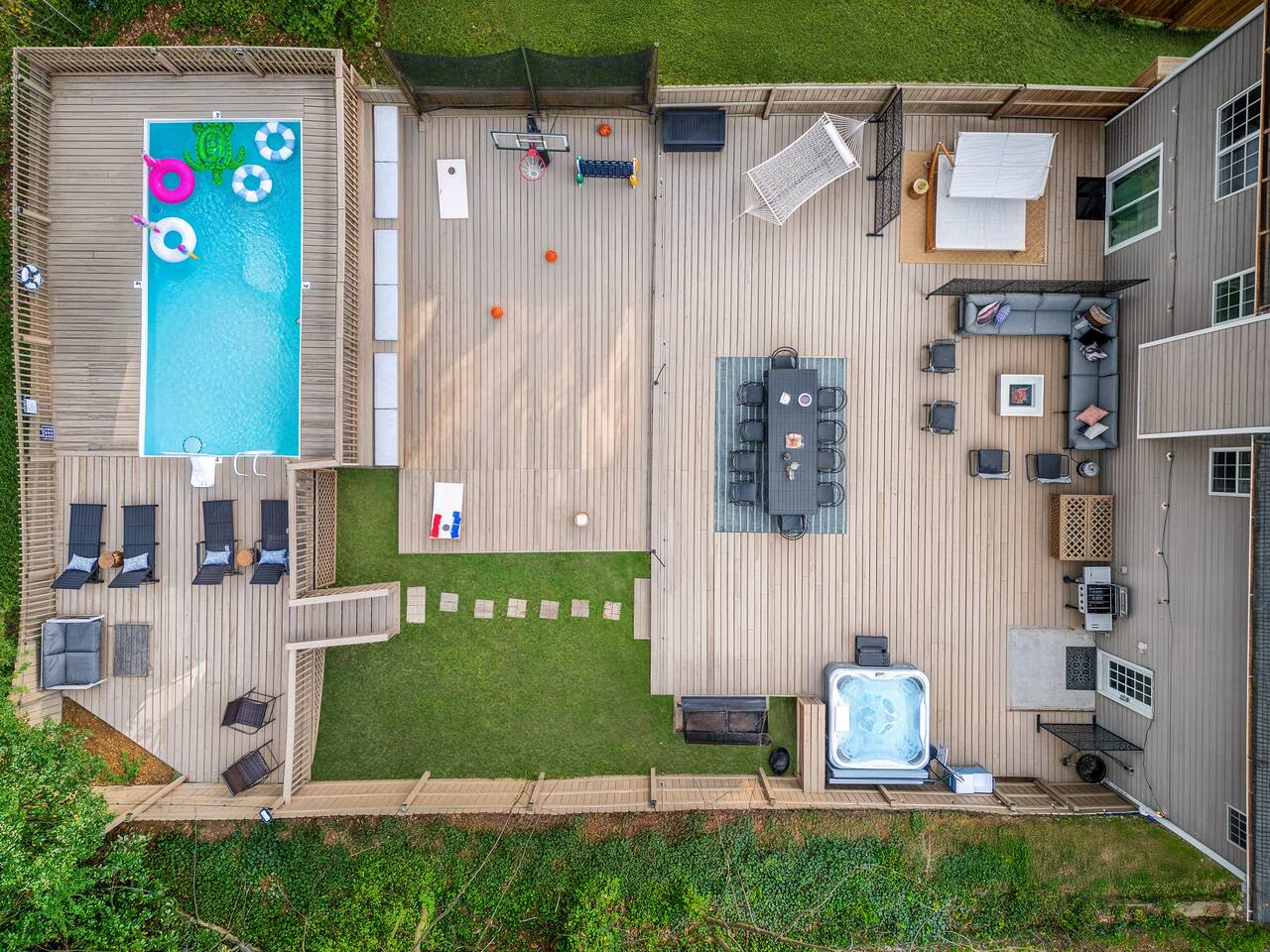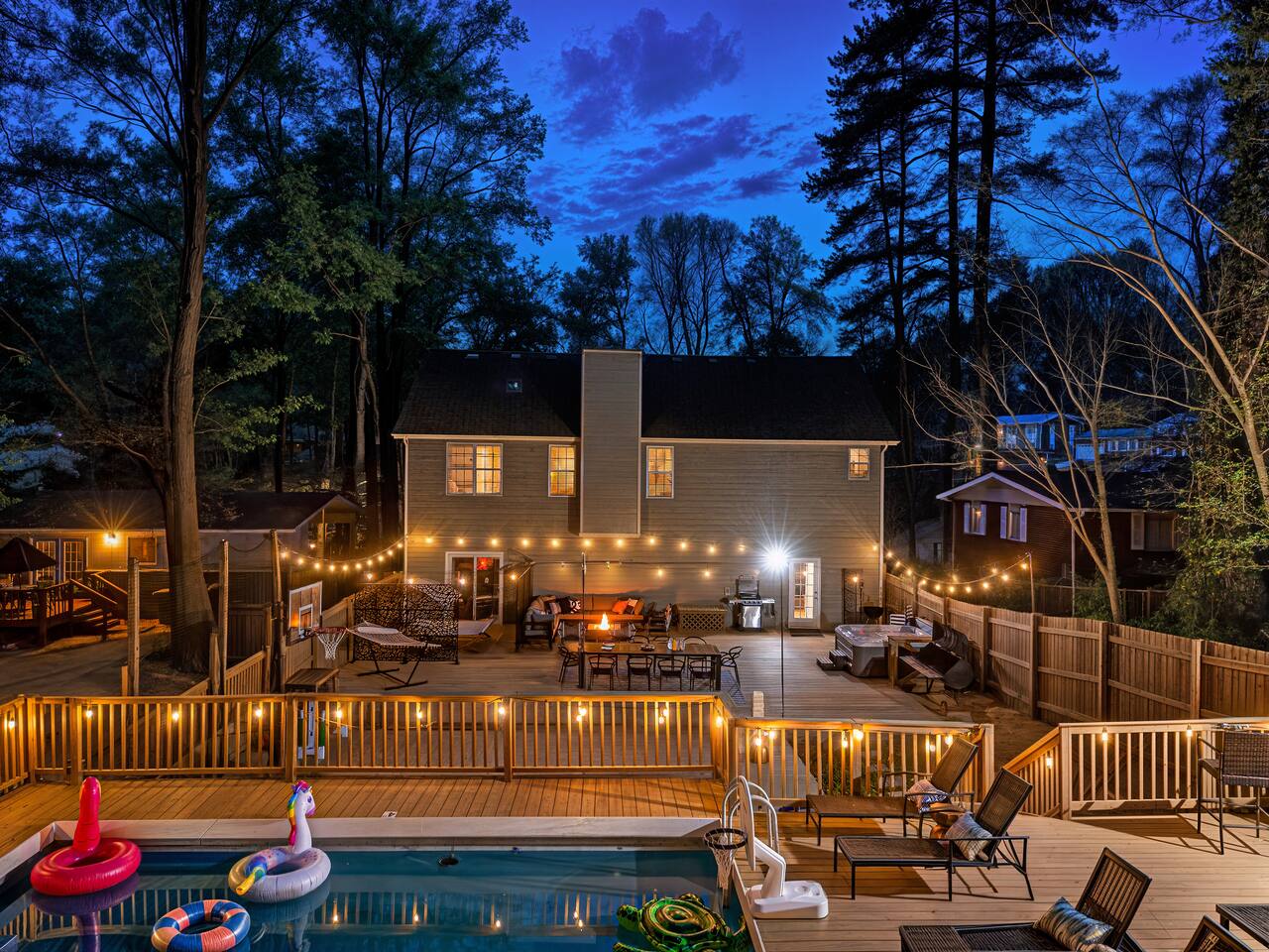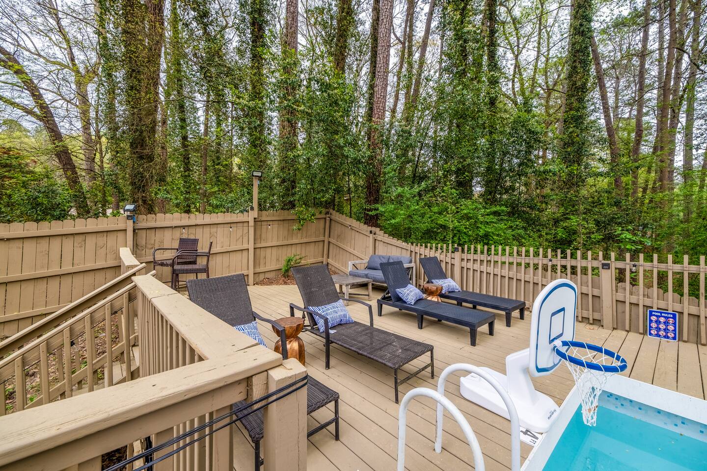 Rental Agreement and Pool & Spa Liability Waiver are required at this property. Bedrooms The home provides 5 Bedrooms and 3 bathrooms across two levels: ~Upstairs~ BR1: King Bed + Master Bathroom + TV BR2: Queen Bed + TV BR3: Queen Bed + TV 1 Shared Bathroom ~Downstairs~ BR4: Queen Bed + TV BR5: (2) Twin Bunks (4 beds total) 1 Shared Bathroom Huge Outdoor Patio • Basketball Court • Pool (4ft deep) w/ Basketball and Floaties • Hot Tub seating for 5 Guests • Luxury Day Bed • Hammock • Dining Table seating for 10 Guests • Patio Sofa/Chairs accommodating 12+ Guests • Gas Fire Pit • Stainless Steel 4-Burner Gas Grill • Double Barrel Smoker • Outdoor Games (Cornhole, Giant Jenga, Connect 4) Home Theater & Game Room • 120" Projector Screen • Edifier 2.1 Sound System • Comfortable Lounge Chairs • Popcorn Machine • Pool Table / Ping Pong Table • Shuffleboard Table • Foosball Table • ESPN Basketball Arcade • 65" TV • Arcade Games: Pacman • Hand Painted Custom Mural *** Brand new AC Unit added Oct 2024*** Centrally located to all things Atlanta: • Hartsfield Jackson Int. Airport: 20 Min • Mercedes Benz Stadium: 12 Min • Truist Park: 20 Min • World of Coca-Cola: 15 Min • Atlanta Aquarium: 15 Min • Centennial Olympic Park: 12 Min • Atlanta Zoo: 16 Min • Six Flags over Georgia: 9 Min • GA Tech: 16 Min • Ponce City Market: 20 Min • Buckhead: 22 Min *** Large Events & Parties are PROHIBITED. As per Airbnb's policies; if an event or party is detected, guests will be asked to vacate the property via local law enforcement. *** If you are hosting a small gathering or a birthday party, please feel free to reach out and we can talk about it. The "ATL Patio Paradise" is a 2000+ sqft single family home with an enormous 1000+ sqft, two level private, fenced outdoor patio. With 5 bedrooms and 3 bathrooms, this spacious house can comfortably accommodate up to 12 guests. Living Room Step into this beautiful space adorned with a warm ATL sign, casting a soft glow against lush greenery, creating an inviting ambiance that's both chic and welcoming. Sink into the comfort of our oversized sectional, perfect for lounging and relaxation after a day of play. Immerse yourself in entertainment with a 65" Smart TV, offering endless streaming options for your viewing pleasure. Kitchen & Dining From the living room walk into a fully equipped kitchen with a brand new pot & pan set, indoor and outdoor dinnerware, kid-friendly dinnerware and cutlery, complimentary coffee, spices and condiments. Enjoy a family meal at the picnic style dining table and play a fun game of checkers or tic-tac-toe on the interactive wall-art. Additionally a high chair is available for use located in the pantry. Bedrooms There are 3 bedrooms located on the main floor. The master bedroom boasts a king-sized canopy bed, 65" TV with an Amazon fire stick and dimmable lights allowing you to set the perfect ambiance for relaxation or productivity. A sleek vanity desk awaits, ideal for your morning routine or evening pampering sessions. Enjoy the en-suite bathroom where you'll find both a shower and lounging tub along with double vanity sinks. Whether you're unwinding after a long day or preparing for a new one, this master bedroom offers everything you need for your stay. Two additional bedrooms located on the main floor offer a luxurious queen bed with ample storage for clothing between the dressers and closets as well as Amazon fire stick enabled TV's for your viewing pleasure. Right outside these bedrooms you can find a shared full bath. On the lower level there is an additional luxurious queen bedroom with ample storage. Down the hall is a large, newly renovated shared full bathroom. Home Theater Room Welcome to our ultimate home theater experience! Immerse yourself in the action on our massive 120" projector screen, paired with a 2.1 sound system that delivers crystal-clear audio, bringing movies to life like never before. Indulge in the classic cinema experience with our vintage popcorn machine and set the mood with dimmable sconce lighting and black out curtains. Sink into the plush comfort of our lounge seats while you enjoy your favorite streaming service or connect your favorite device to the provided HMDI. Located in the theater room are two twin bunk beds for a total of 4 available beds. Game Room Welcome to our epic game room, where play knows no bounds! Challenge your friends to a game of pool on our versatile table that converts to ping pong for added excitement. Test your skills on our shuffleboard table or enjoy classic arcade nostalgia with Pac-Man or our ESPN basketball Pop-a-Shot. Sit back and catch the latest game or enjoy gaming sessions on our Amazon Fire Stick enabled TV, ensuring non-stop entertainment. Note: The game room is not connected to the house HVAC and get a little chilly in the winter. Be sure to snap a photo in front of the vibrant custom mural hand painted by East Coast muralist Liza S, transforming the space into a truly unique experience. (ig: liza_s_art) Outdoor Patio Welcome to this sprawling outdoor oasis, spanning over 1000 square feet of entertainment! Decompress in the soothing waters of our 5-seat hot tub, complete with jets and lights, offering a tranquil retreat under the starlit sky. Gather around the oversized outdoor sectional and plush seating arrangement, basking in the warmth of the gas fire pit, perfect for cozy evenings with friends and family. For the culinary enthusiasts, enjoy our brand new stainless steel grill and double barrel smoker. Challenge your friends and family to a game of basketball on our court or cool off in the refreshing pool (4ft), equipped with basketball hoops and floaties for added fun. Unwind in style on our luxury day bed or sway gently in the hammock, embracing the serenity of outdoor living. Share meals and laughter at the dining table, generously accommodating up to 10 guests, while the aroma of smoked delicacie